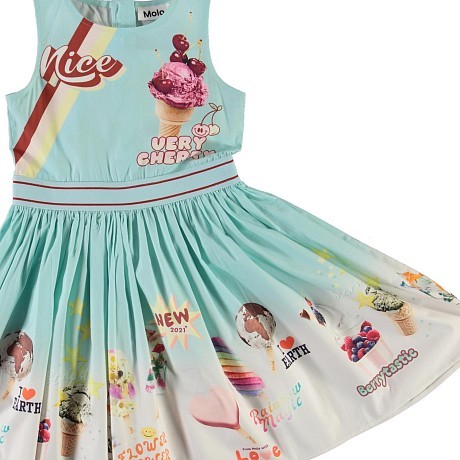 Платье для девочки Molo – это идеальный выбор для теплых дней! Изготовленное из 97% органического хлопка и 3% эластана, оно украшено очаровательными изображениями мороженого и ягод. Красочные мотивы на светло-бирюзовой основе создают легкое и веселое настроение. На фото видна аккуратная красная окантовка по краю и мягкое платье с юбкой-солнцем. Качество от датского бренда и внимание к деталям делают эту модель отличным выбором для вашего ребенка!