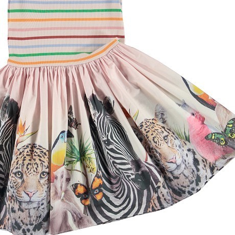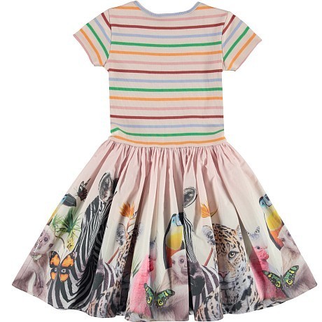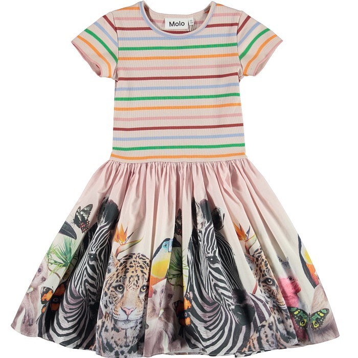 Платье для девочек Molo – это идеальный выбор для стильных и активных девочек! Изготовленное из 100% органического хлопка, оно украшено ярким принтом с изображениями животных, полосками и зелеными листьями. Красочные полосы на лифе создают легкость и радость, а принт на юбке добавляет игривости и неповторимости. На фотографии видны изображения леопарда, зебры, птицы и бабочки, а также зеленые листья и желтые цветы. Нежная ткань и удобная посадка делают это платье комфортным и стильным выбором для вашего ребенка!