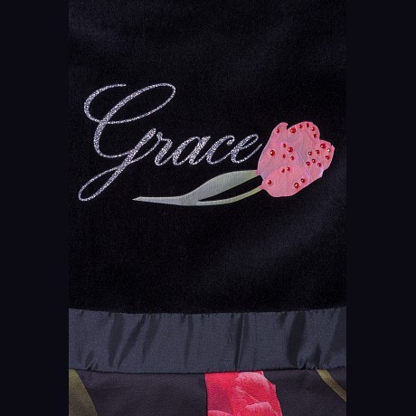 • 🎨 Дизайн: розовые тюльпаны на черном фоне, мех на воротнике