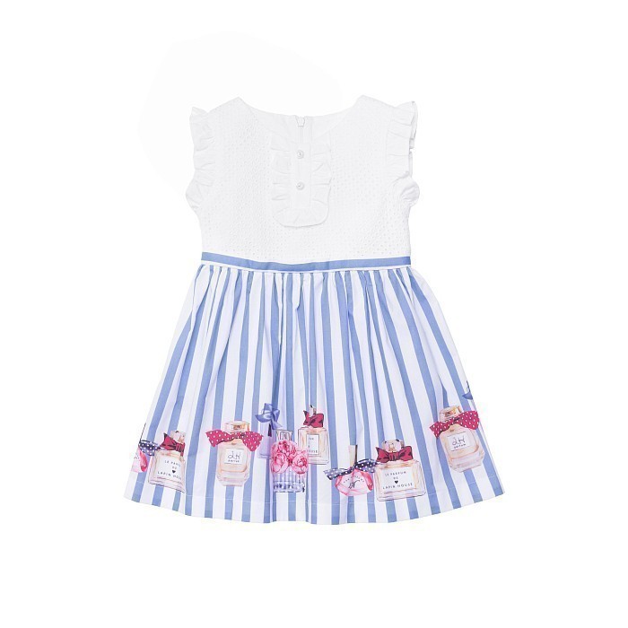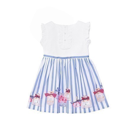 Платье Lapin House – это идеальный выбор для девочек! Изготовленное из 98% хлопка и 2% эластана, оно украшено очаровательными парфюмерными бутылочками и цветочками на бело-голубой полосатой юбке. Нежная ткань с аккуратными воланами на рукавах и воротнике создает нежный и элегантный образ. На фотографиях видны аккуратные воланы, цветочные мотивы и элегантные бутылочки с бантиками. Качество от бренда из Греции и внимание к деталям делают эту модель отличным выбором для вашего ребенка!