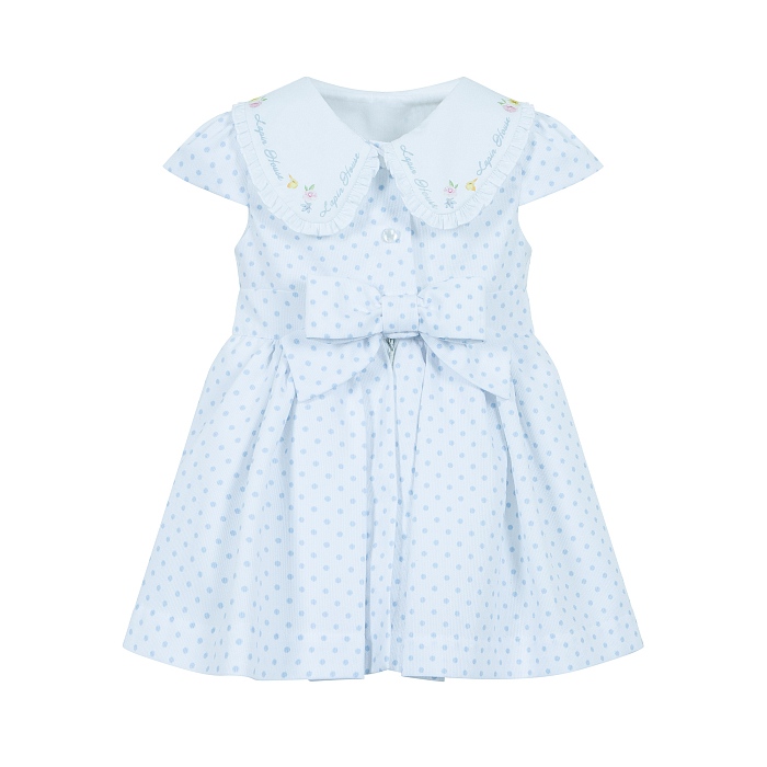 Платье для девочки Lapin House – это идеальный выбор для теплых дней! Изготовленное из комбинации хлопка и полиэстера, оно украшено очаровательным принтом в виде мелких голубых точек на белом фоне. Классический воротничок с бантом и пуговицей на груди делают это платье нежным и элегантным. На фотографиях видна аккуратная голубая окантовка по краю и мягкая текстура ткани. Качество от бренда из Греции и внимание к деталям делают эту одежду отличным выбором для вашего ребенка!