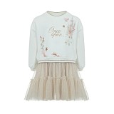 Платье Lapin House – это идеальное сочетание уюта и торжественности для вашей малышки! Верхняя часть выполнена в виде мягкого свитшота молочного цвета с нежным принтом: розовый замок, цветы и надпись «Once upon...» (Однажды...). Низ платья украшен пышной многослойной юбкой из легкого тюля, создающей эффект пачки балерины. Благодаря подкладке из 100% хлопка, платье будет комфортно и приятно к телу ребенка. Прекрасный выбор для праздников и прогулок!