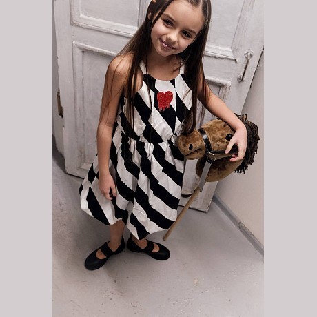 Платье для девочек Pinko Up – это идеальный выбор для стильных и модных девочек! Изготовленное из 100% хлопка, оно украшено черными и белыми диагональными полосами и красным сердечком на груди. Нежная текстура ткани и удобная посадка делают это платье комфортным и стильным. На фотографиях видна аккуратная черная контрастная окантовка по краю и мягкая текстура ткани. Качество от бренда из Италии и внимание к деталям делают эту модель отличным выбором для вашего ребенка!