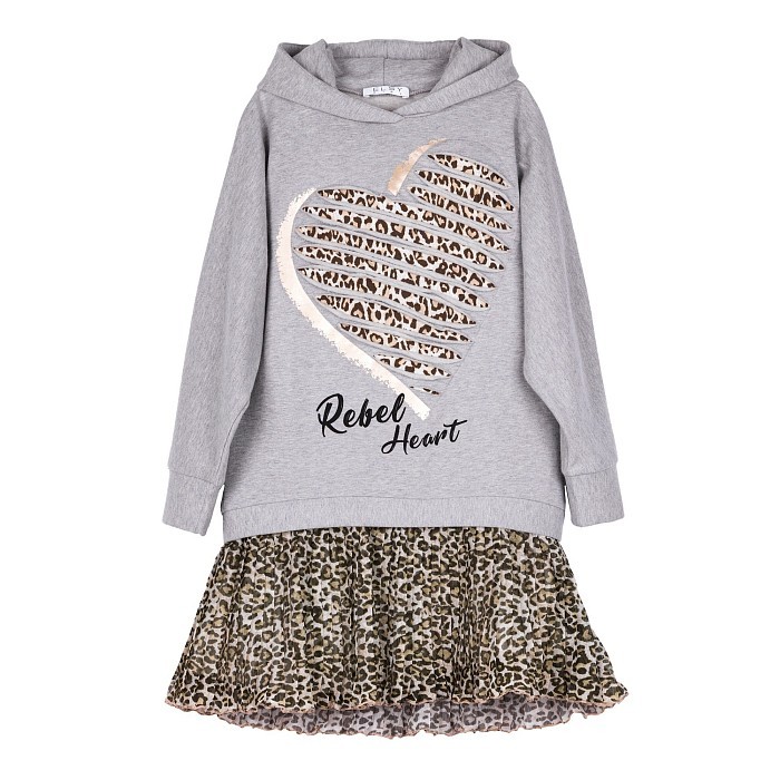 Платье тр. для девочки Elsy – это стильный и комфортный выбор для вашего ребенка! Изготовленное из 95% хлопка и 5% эластана, оно дополнено ярким принтом леопарда и надписью "Rebel Heart". Нежная ткань и эластичная резинка по низу создают идеальную посадку. На фотографии видна аккуратная вышивка леопардовых пятен и надпись "Rebel Heart" на сером фоне. Качество от итальянского бренда Elsy делает это платье тр. отличным выбором для вашего ребенка!