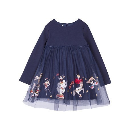 Платье тр. для девочки Elsy – это идеальный выбор для маленьких модниц! Изготовленное из комбинации 95% хлопка и 5% эластана, оно дополнено кружевной юбкой и ярким принтом с клоунами, цирковыми животными и звездами на темно-синем фоне. Кружевная юбка придает платью легкость и шарм, а принт с клоунами и цирковыми животными делает его ярким и веселым. На фотографиях видны аккуратные кружевные вставки по краю юбки и мягкая текстура ткани. Качество от Китая и внимание к деталям делают это платье отличным выбором для вашего ребенка!