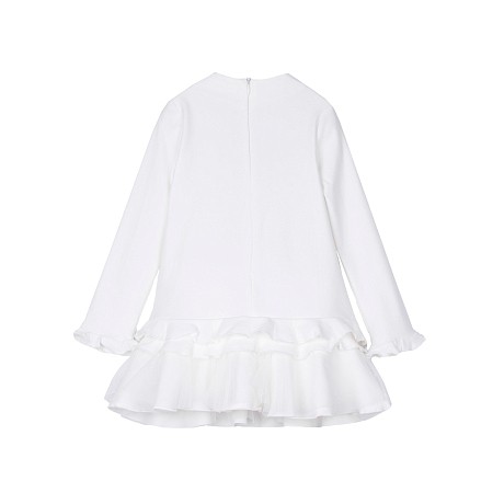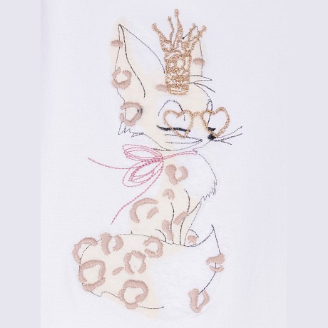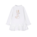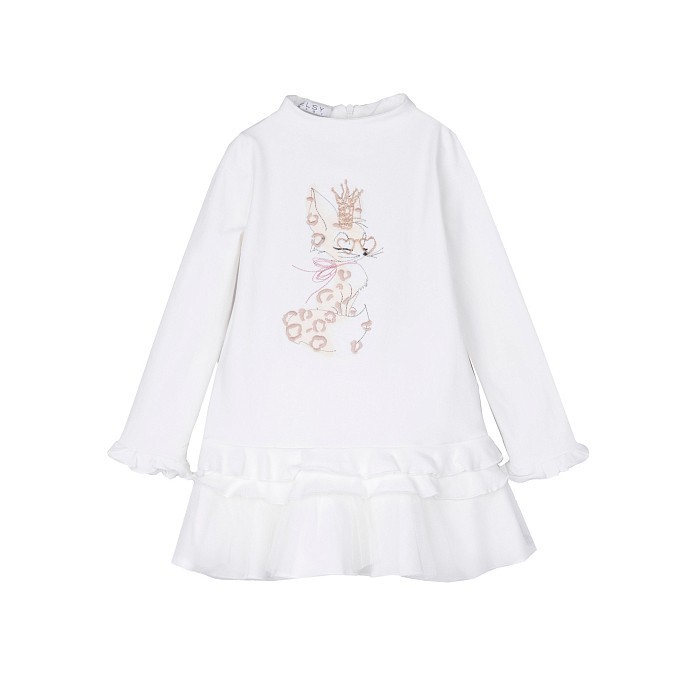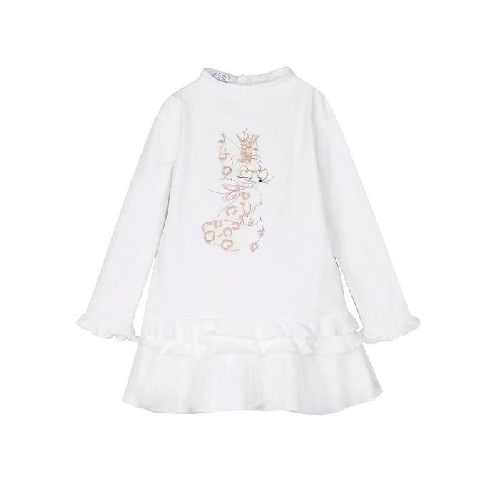 Платье тр. Elsy – это идеальный выбор для маленьких модниц! Изготовленное из 95% хлопка и 5% эластана, оно дополнено очаровательным принтом кролика с леопардовыми пятками. Мягкая и эластичная ткань создает комфортную посадку, а рюши по низу и рукавам придают платью нежный и романтичный вид. На фотографии видна аккуратная вышивка кролика с леопардовыми пятками и рюши по краю. Качество от итальянского бренда и внимание к деталям делают эту модель отличным выбором для вашего ребенка!
