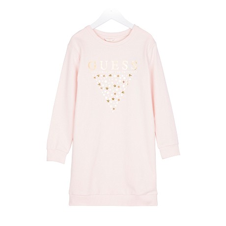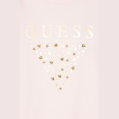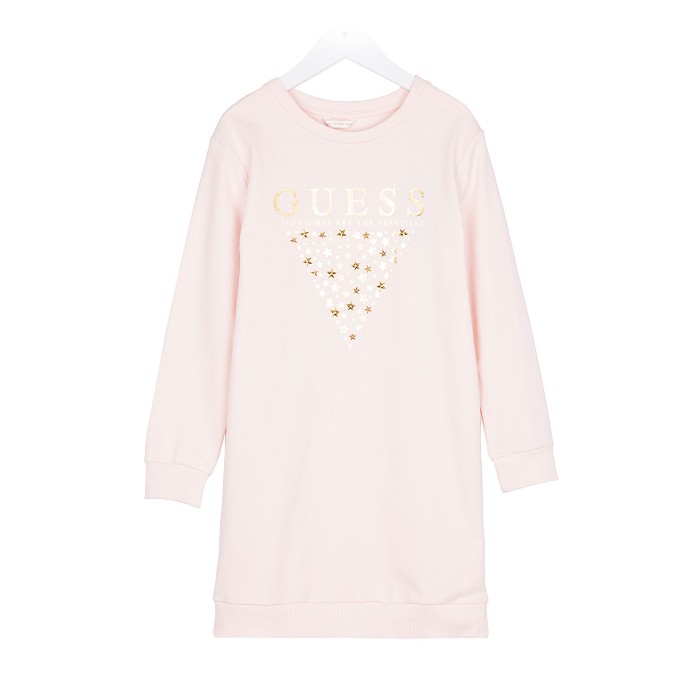 Платье тр. Guess – это идеальный выбор для стильных девочек! Изготовленное из 95% хлопка и 5% других волокон, оно украшено золотистыми звездами и логотипом Guess. Нежно-розовая основа с золотистыми звездами и белыми блестками создает яркий и модный образ. На фотографии видна аккуратная отделка по краю и мягкая текстура ткани. Качество от бренда Guess и внимание к деталям делают эту модель отличным выбором для вашего ребенка!