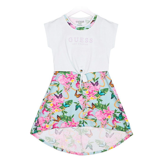 Платье тр. для девочки Guess – это идеальный выбор для маленьких модниц! Изготовленное из 95% хлопка и 5% эластана, оно украшено ярким цветочным принтом и бабочками. Великолепный бирюзовый фон с розовыми цветами и бабочками создает нежный и в то же время яркий образ. На фото видна аккуратная белая контрастная окантовка по краю и мягкая текстура ткани. Качество от бренда из США и внимание к деталям делают эту одежду отличным выбором для вашего ребенка!