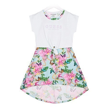 Платье тр. для девочки Guess – это идеальный выбор для маленьких модниц! Изготовленное из 95% хлопка и 5% эластана, оно украшено ярким цветочным принтом и бабочками. Великолепный бирюзовый фон с розовыми цветами и бабочками создает нежный и в то же время яркий образ. На фото видна аккуратная белая контрастная окантовка по краю и мягкая текстура ткани. Качество от бренда из США и внимание к деталям делают эту одежду отличным выбором для вашего ребенка!