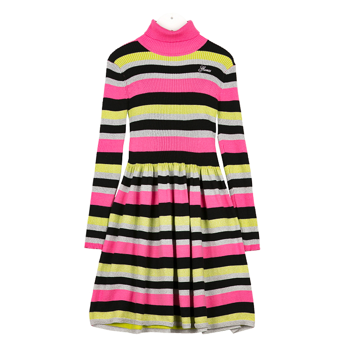 Платье тр. для девочки Guess – это идеальный выбор для стильных и модных девочек! Изготовленное из 33% хлопка, 33% вискозы, 17% полиамида, 12% полиэстера и 5% металлизированного волокна, оно идеально подойдет для осенних и весенних дней. Яркие разноцветные полоски создают неповторимый стиль и привлекают внимание. На фото видна аккуратная вышивка логотипа Guess на воротнике и эластичная резинка по низу платья. Качество от американского бренда Guess делает это платье отличным выбором для вашего ребенка!
