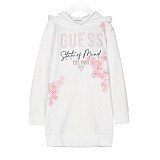 Платье тр. для девочки Guess – это стильный и удобный вариант для вашего ребенка! Изготовленное из 100% хлопка, оно украшено принтом Guess State of Mind и цветочным узором. На передней части виден крупный принт с надписью "Guess State of Mind" и датой основания бренда "EST. 1981". Красивые цветы на рукавах и по бокам создают нежный и романтичный образ. Платье с капюшоном и удобной посадкой обеспечивает комфорт и тепло для вашего ребенка. На фотографиях видна аккуратная отделка по краю и мягкая текстура ткани. Качество от бренда Guess и внимание к деталям делают это платье отличным выбором для вашего малыша!