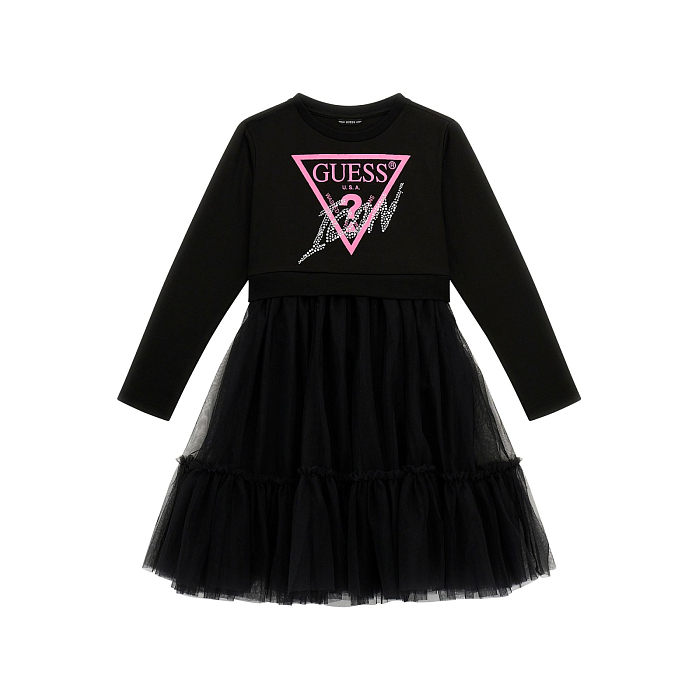 Платье для девочек Guess – это идеальный выбор для стильных и комфортных выходов! Изготовленное из 100% хлопка и полиамида, оно украшено ярким принтом Guess U.S.A. и сетчатым подолом, который придает платью легкость и воздушность. Нежная ткань и стильный дизайн делают это платье отличным выбором для маленьких модниц!