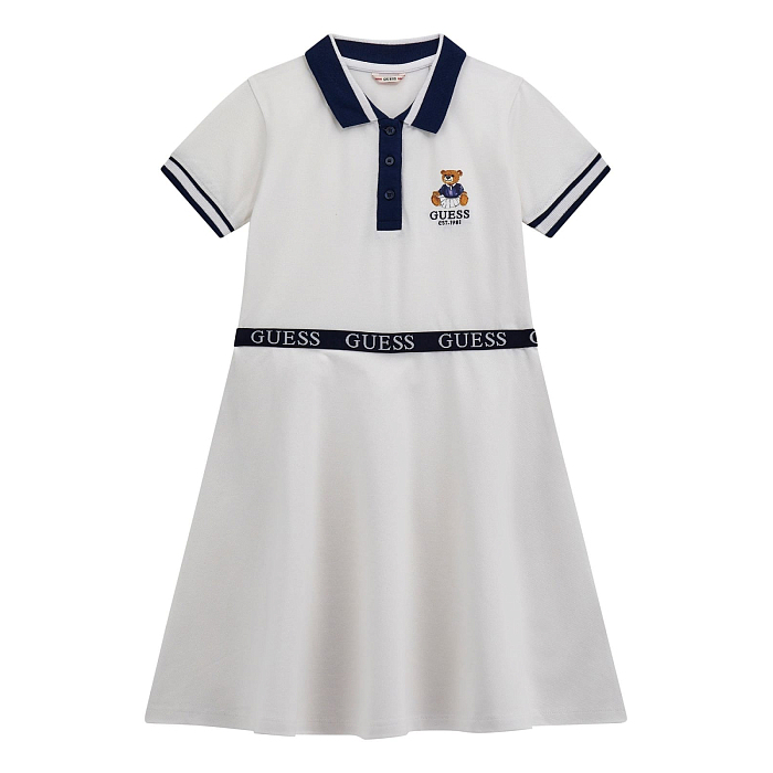 Платье для девочек Guess – это идеальный выбор для стильных и комфортных выходов! Изготовленное из 95% хлопка и 5% эластана, оно дополнено 100% хлопковой отделкой. Мягкая ткань обеспечивает идеальную посадку и комфорт. На платье изображены очаровательный медведь и логотип Guess, что делает его идеальным аксессуаром для маленьких модниц. На фотографиях видна аккуратная отделка по краю рукавов и воротника, а также мягкая текстура ткани. Качество от бренда США и внимание к деталям делают эту одежду отличным выбором для вашего ребенка!