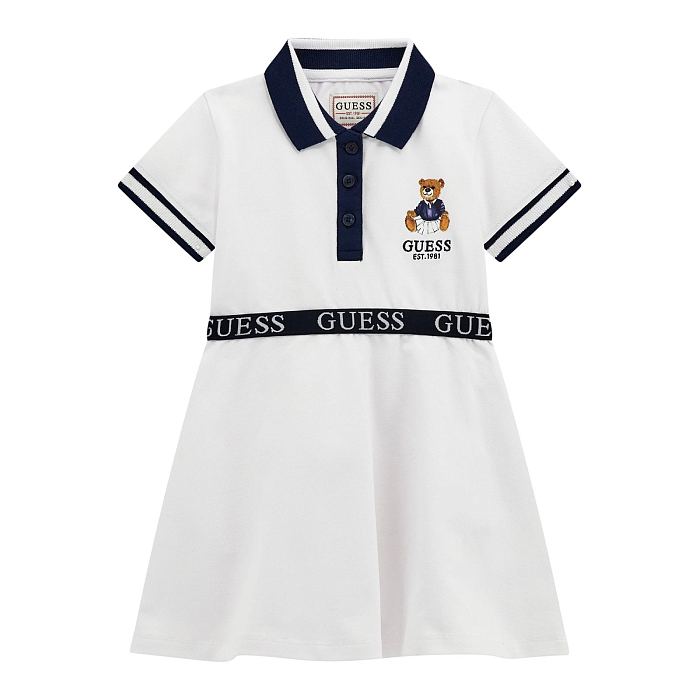 Платье Guess – это идеальный выбор для девочек! Изготовленное из 95% хлопка и 5% эластана, оно украшено очаровательным принтом медведя. Мягкая белая основа с нежным принтом медведя и надписью Guess создает неповторимый образ. На фотографиях видна аккуратная белая окантовка по краю и удобная посадка. Качество от бренда из США и внимание к деталям делают эту одежду отличным выбором для вашего ребенка!