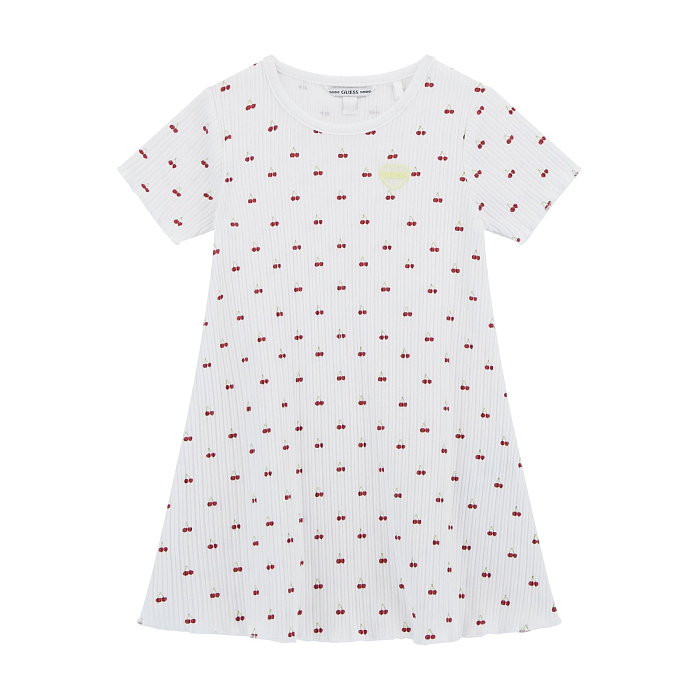 Платье для девочки Guess – это идеальный выбор для маленьких модниц! Изготовленное из 98% хлопка и 2% эластана, оно украшено очаровательными красными вишнями на белом фоне. Нежная белая основа с яркими красными вишнями создает приятное и в то же время стильное настроение. На фотографиях видна аккуратная белая окантовка по краю и мягкая текстура ткани. Качество от бренда из США и внимание к деталям делают эту модель отличным выбором для вашего ребенка!
