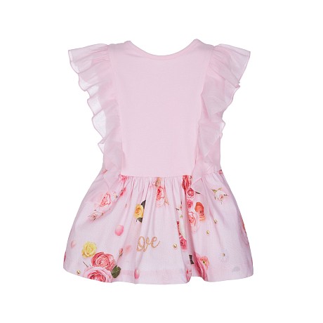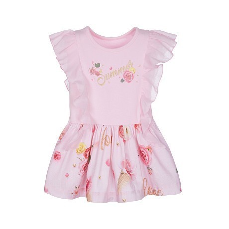 Платье для девочек Lapin House – это идеальный выбор для теплых дней! Изготовленное из 96% хлопка и 4% эластана, оно украшено очаровательными летними цветами и надписью Summer. Нежный розовый цвет с яркими розами, желтыми цветами и золотыми буквами создает легкое и радостное настроение. На фотографии видна удобная посадка с воланами на рукавах и мягкими басками. Качество от бренда из Греции и внимание к деталям делают эту модель отличным выбором для вашего ребенка!