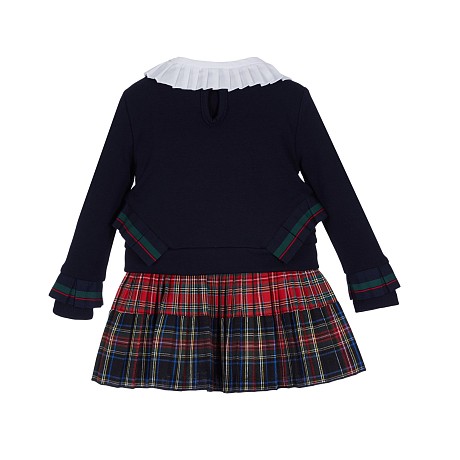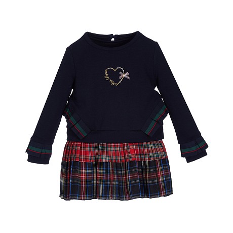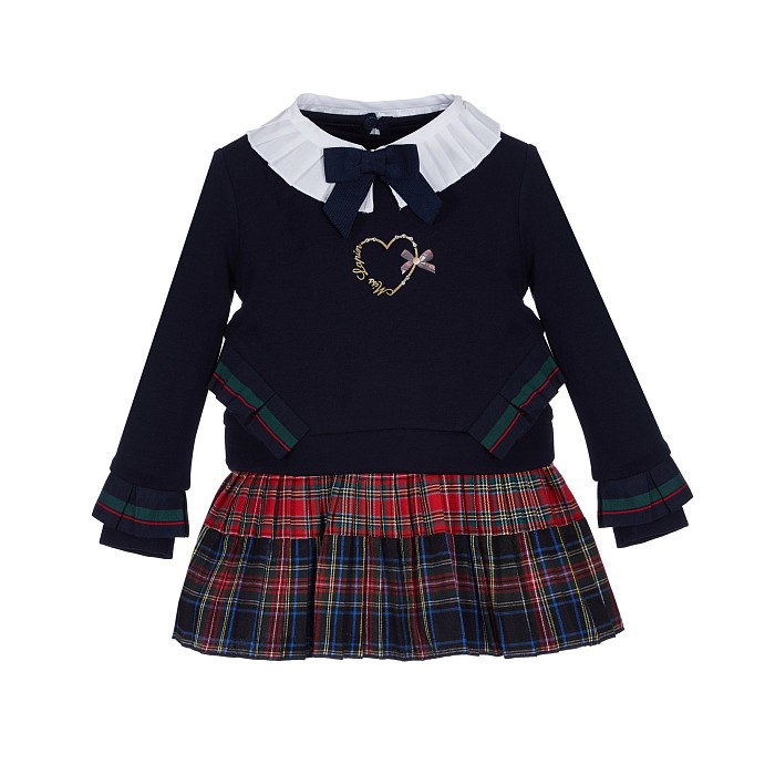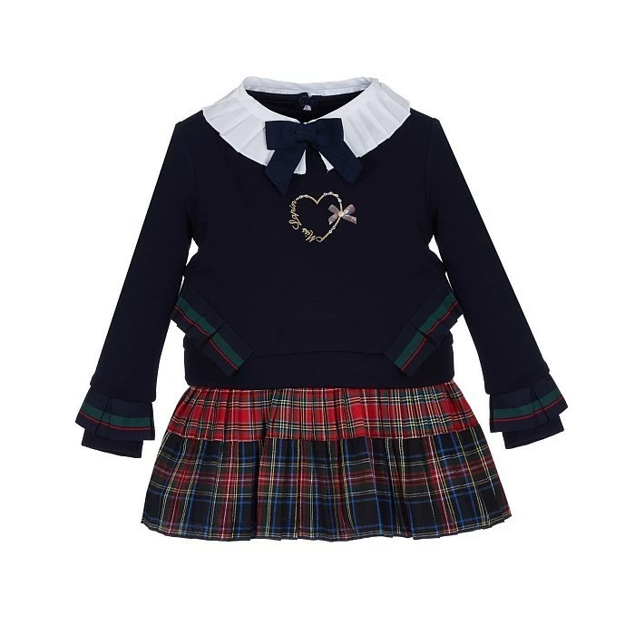 - 🎨 Дизайн: сердце, клетка, воротник-стойка, оборки, клетчатая юбка