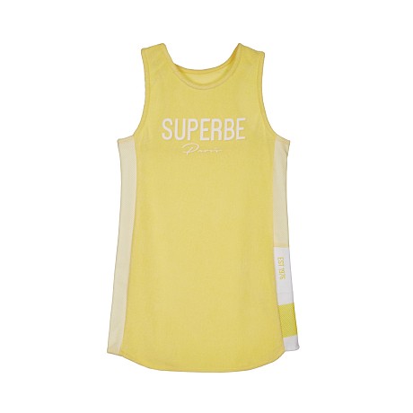 Платье тренажерное Lapin House – идеальный выбор для активных девочек! Изготовленное из комбинации 73% хлопка, 25% тактеля и 2% лайкры, оно обеспечивает комфорт и свободу движений. Желтый цвет создает яркий и позитивный настрой, а дизайн от Греции придает платью уникальность и модный вид. На платье видна надпись "SUPERBE" и логотип "Paris", а также белая полоска с надписью "EST 1976" на правом рукаве. Нежная текстура ткани и эластичные вставки обеспечивают идеальную посадку и удобство при движении.
