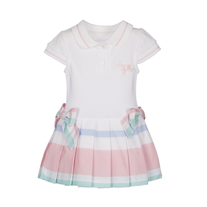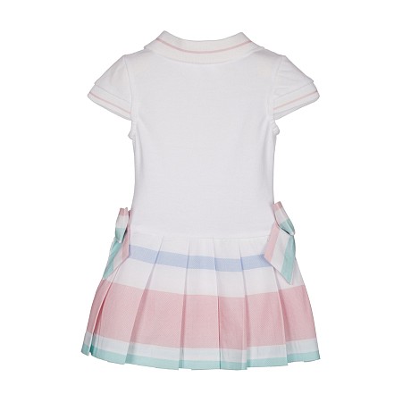 Платье тр. для девочки Lapin House – это идеальный выбор для маленьких модниц! Изготовленное из 99% хлопка и 1% лайкры, оно украшено очаровательным принтом и бантом на юбке. Нежная белая основа с розовыми и синими полосами создает яркий и стильный образ. На фотографии видна аккуратная отделка по краю и мягкая текстура ткани. Качество от бренда из Греции и внимание к деталям делают эту модель отличным выбором для вашего ребенка!