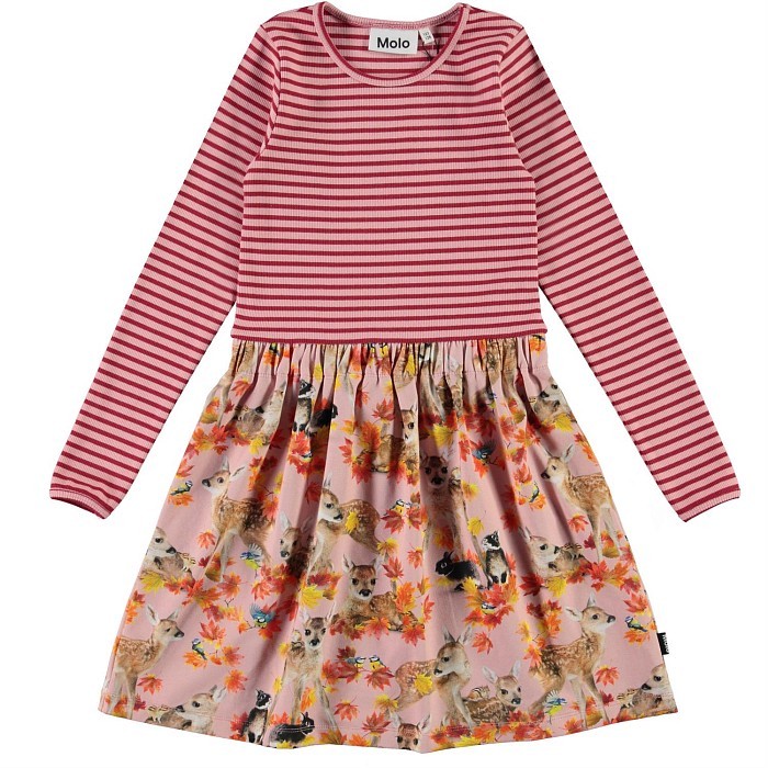 Платье тр. Molo – это идеальный выбор для девочек! Изготовленное из 95% хлопка органического и 5% эластана, оно украшено очаровательным принтом с животными и листьями. Нежная розовая основа с яркими изображениями животных и осенних листьев создает игривое и волшебное настроение. На фотографии видны милые оленята, зайцы, птички и осенние листья на розовом фоне. Качество от бренда из Дании и внимание к деталям делают эту модель отличным выбором для вашего ребенка!