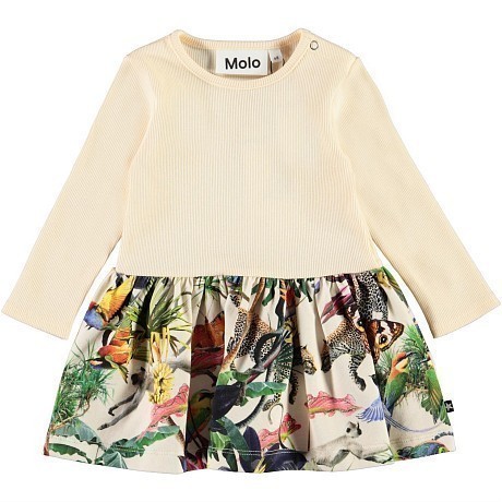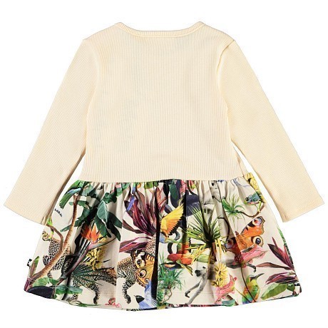 Платье тр. для девочки Molo – это идеальный выбор для теплых дней! Изготовленное из 95% хлопка органического и 5% эластана, оно украшено ярким тропическим принтом с леопардами, птицами и тропическими растениями на белом фоне. Нежная ткань и удобная посадка делают это платье комфортным и стильным. На фотографиях видны аккуратные детали, такие как мягкая окантовка по краю и удобная застежка на спинке. Качество от бренда из Дании и внимание к деталям делают эту модель отличным выбором для вашего ребенка!