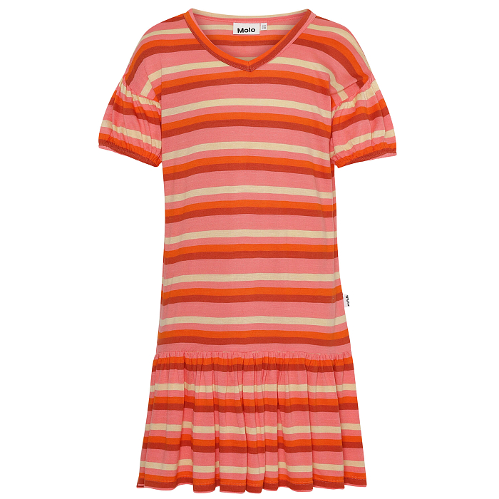 Платье тр. Molo – это идеальный выбор для девочек! Изготовленное из 100% вискозы, оно оформлено яркими полосками в нежных оттенках розового, оранжевого и белого. Дизайн с V-образным вырезом и рукавами-фонариками создает стильный и удобный образ. На фотографии видна аккуратная вязаная резинка по краю платья и мягкая текстура ткани. Качество от бренда из Дании и внимание к деталям делают эту модель отличным выбором для вашего ребенка!