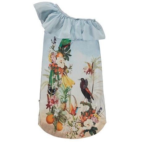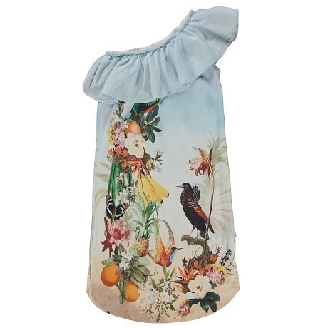 Платье тр. для девочки Molo – это идеальный выбор для теплых дней! Изготовленное из 100% органического хлопка, оно украшено тропическим принтом с яркими фруктами, цветами и птицами на светло-голубом фоне. Нежная ткань с рюшами по плечам создает легкость и комфорт. На фотографиях видны аккуратные рюши, яркие фрукты и цветы, а также птицы, что делает платье не только стильным, но и увлекательным для вашего ребенка!