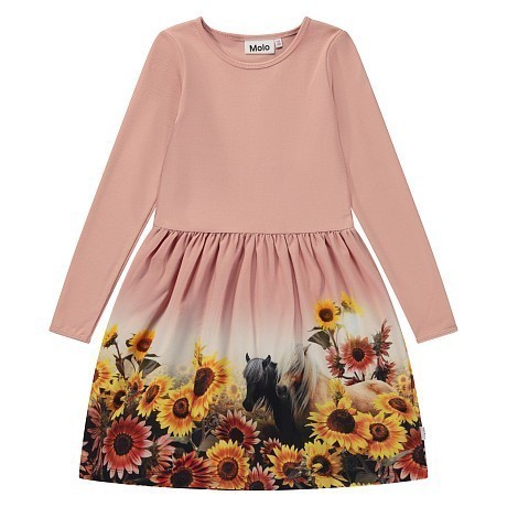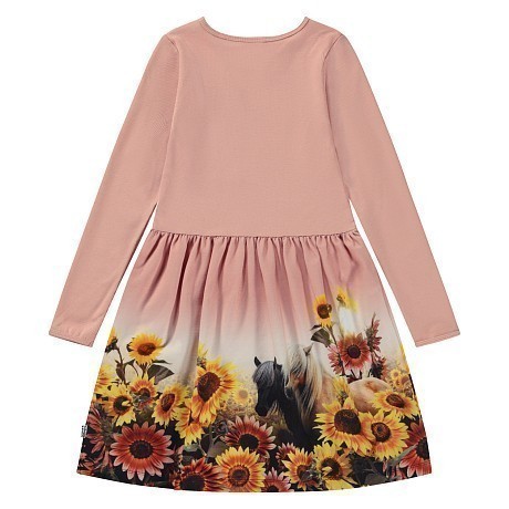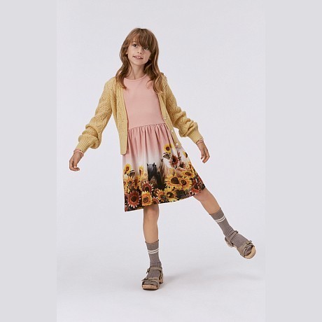 Платье для девочек Molo – это идеальный выбор для маленьких модниц! Изготовленное из 95% натурального хлопка и 5% эластана, оно украшено очаровательным принтом с лошадьми и подсолнухами. Розовая основа с яркими цветами и животными создает радостное и веселое настроение. На фотографиях видны аккуратные линии швов и мягкая текстура ткани. Качество от бренда из Дании и внимание к деталям делают это платье отличным выбором для вашего ребенка!