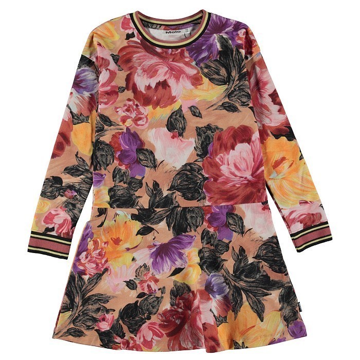 Платье тр. для девочки Molo – это идеальный выбор для весны! Изготовленное из 95% натурального хлопка и 5% эластана, оно украшено ярким цветочным принтом с крупными розами, пионами и лилиями на фоне нежного персикового цвета. Красочная и стильная модель с длинными рукавами и круглым вырезом горловины создаст неповторимый образ для вашего ребенка. На фотографиях видны аккуратные контрастные полоски по краю рукавов и нежная текстура ткани. Качество от бренда из Дании и внимание к деталям делают эту модель отличным выбором для весеннего гардероба!