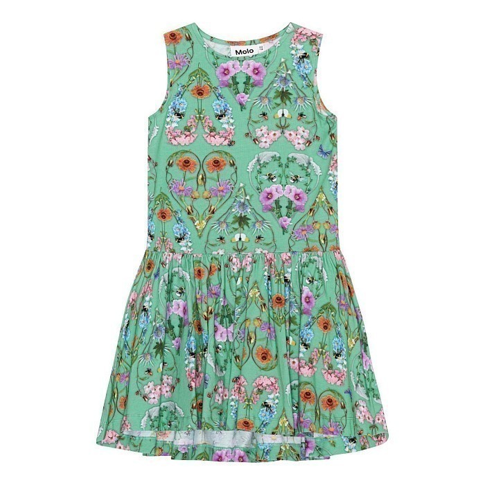 Платье тр. для девочки Molo – это идеальный выбор для весны и лета! Изготовленное из 95% хлопка и 5% эластана, оно украшено ярким цветочным принтом с бабочками и пчелами на зеленом фоне. Нежная ткань с цветочками и бабочками создает легкость и радость. На фотографиях видна аккуратная детализация цветочного принта и мягкость ткани. Качество от бренда из Дании и внимание к деталям делают эту модель отличным выбором для вашего ребенка!