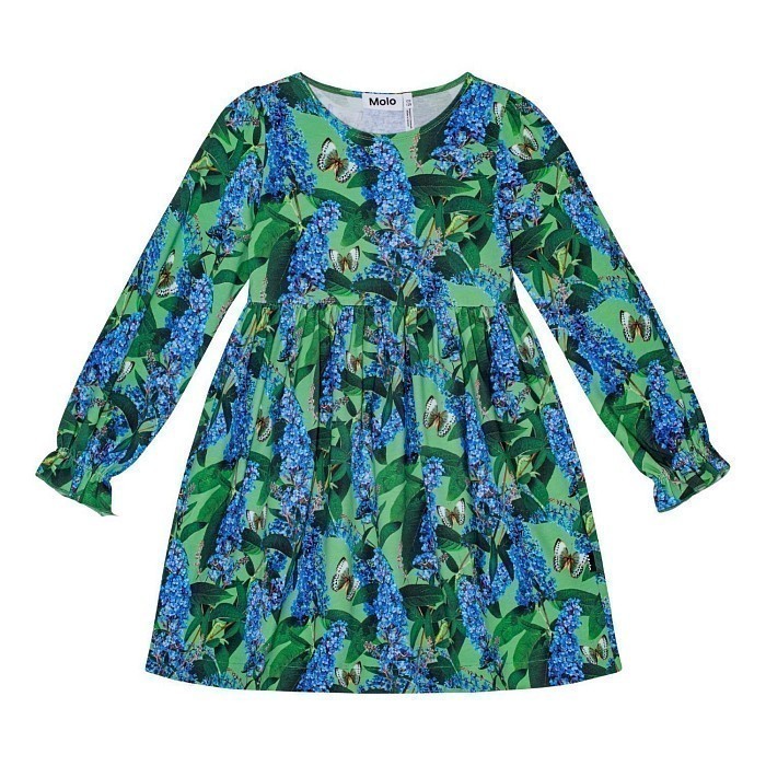 Платье тр. Molo – это идеальный выбор для девочек! Изготовленное из 95% хлопка и 5% эластана, оно украшено очаровательным цветочным принтом с бабочками на зеленом фоне. Яркий синий цвет и нежные бабочки создают неповторимое настроение. На фотографиях видна аккуратная резинка на воротнике и мягкая текстура ткани. Качество от датского бренда и внимание к деталям делают эту модель отличным выбором для вашего ребенка!