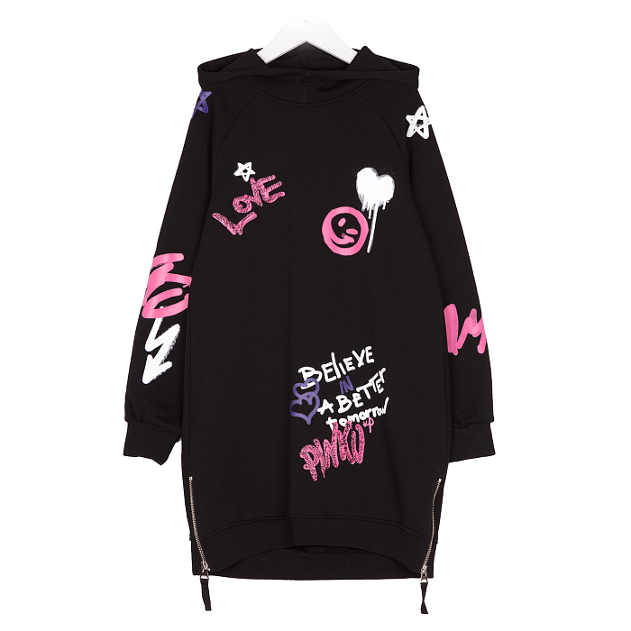 Платье тр. для девочки Pinko Up – это стильный и комфортный выбор для вашего ребенка! Изготовленное из 100% хлопка, оно украшено яркими надписями и принтами, которые делают его неповторимым. На платье видны такие элементы как надписи "LOVE", "BELIEVE", "IN A BETTER tomorrow", звезды, сердечки и другие декоративные детали. Нежная черная основа с яркими розовыми и белыми акцентами создает модный и современный образ. На фото видны аккуратные швы и эластичная резинка на рукавах, которые обеспечивают удобную посадку. Качество от итальянского бренда Pinko Up и внимание к деталям делают это платье тр. отличным выбором для вашего ребенка!