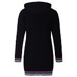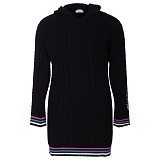 - 🎨 Дизайн: вязаная структура, контрастные вставки на рукавах и внизу платья, капюшон
