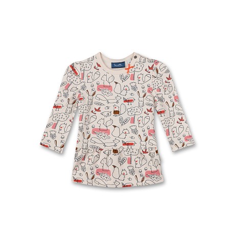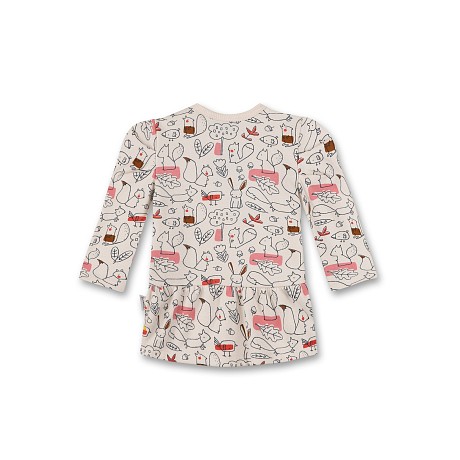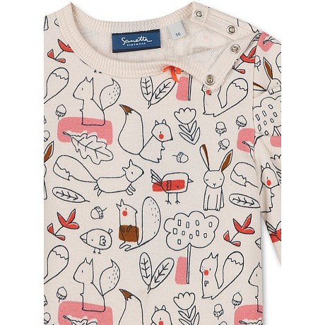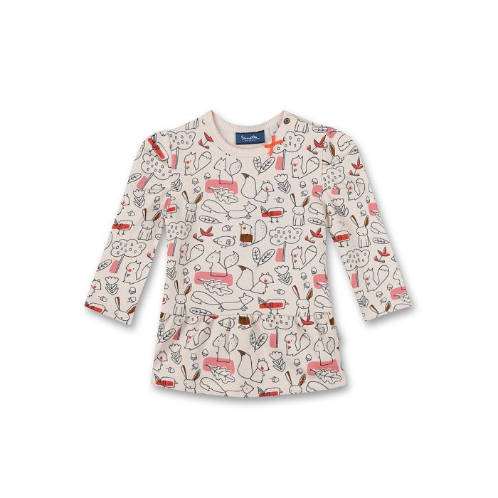 Платье тр. Sanetta – это идеальный выбор для девочек! Изготовленное из 95% органического хлопка и 5% эластана, оно украшено очаровательными рисунками лесных животных и листьев на светло-бежевом фоне. Нежная ткань с яркими рисунками создает приятное и в то же время уютное настроение. На фотографии видны милые зайцы, белки, лисички и другие лесные создания, а также листья и ягоды. Качество от бренда Sanetta и внимание к деталям делают эту одежду отличным выбором для вашего ребенка!