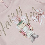 - 🎨 Дизайн: нежный персиковый оттенок, меховые манжеты на рукавах, юбка-плиссе, принт "Fairy Tales" с куклой