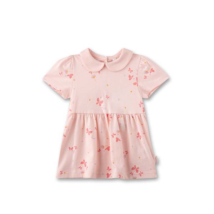 Трикотажное платье Sanetta – идеальный выбор для девочек! Изготовленное из 100% натурального хлопка, оно украшено очаровательными бабочками и цветочками на светло-розовом фоне. Классический воротничок и пышная юбка создают нежный и элегантный образ. На фотографиях видна аккуратная отделка края и мягкая текстура ткани. Качество от бренда из Германии и внимание к деталям делают эту модель отличным выбором для вашего ребенка!
