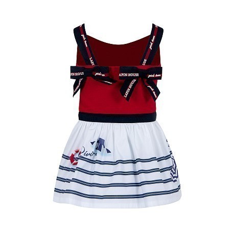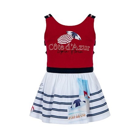 Сарафан Lapin House – это идеальный выбор для маленьких модниц! Изготовленный из 99% хлопка и 1% лайкры, он украшен очаровательным принтом Côte d'Azur с изображением зонтиков и морских пейзажей. Красный верх с белой полоской и принтом Côte d'Azur, а также белая юбка с синими полосками и морскими мотивами создают нежный и в то же время яркий образ. На фотографиях видны аккуратные лямки с надписью Lapin House и мягкая текстура ткани. Качество от бренда из Греции и внимание к деталям делают этот сарафан отличным выбором для вашего ребенка!
