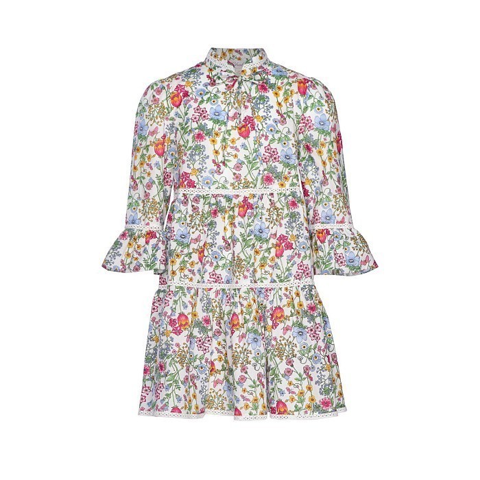 - 🎨 Дизайн: цветочный принт с разноцветными цветами, рукава-фонарики, кружевная отделка