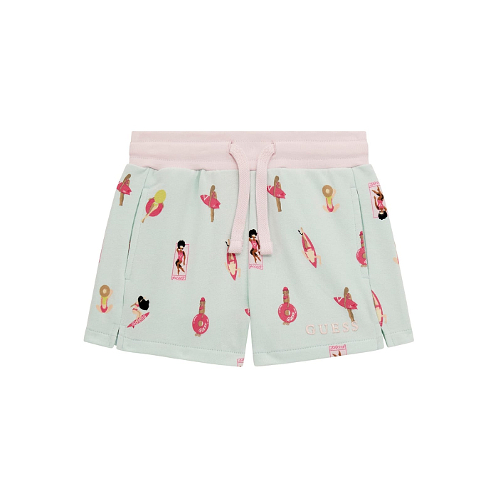 Шорты для девочек Guess – это идеальный выбор для маленьких модниц! Изготовленные из 100% хлопка, они украшены очаровательным принтом с изображениями девушек на пляже, досок для серфинга и круглых надувных кругов на серо-зеленом фоне. Нежная текстура ткани и удобная резинка по талии делают эти шорты комфортными и стильными. На фотографиях видна аккуратная резинка по краю и мягкая текстура ткани. Качество от американского бренда Guess и внимание к деталям делают эти шорты отличным выбором для вашего ребенка!