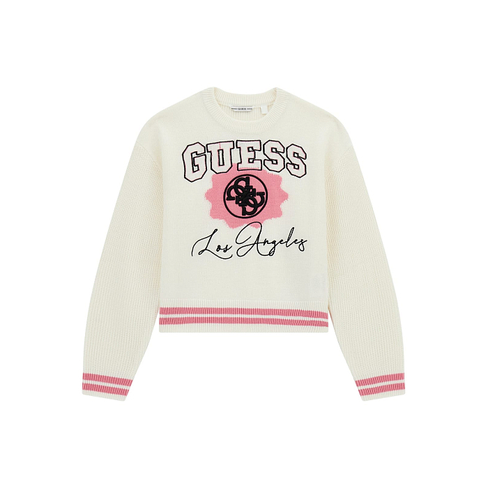 Джемпер Guess – это идеальный выбор для девочек от 7 до 14 лет! Изготовленный из 70% акрила и 30% шерсти, он украшен ярким принтом Los Angeles и логотипом Guess. Белый цвет с розовыми полосками по рукавам и воротнику делает эту модель стильной и модной. На фотографиях видна аккуратная вышивка и мягкая текстура ткани. Джемпер Guess – отличный выбор для вашего ребенка!