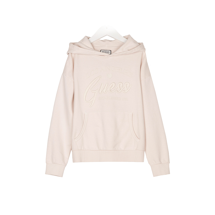 Молочная толстовка Guess – идеальный выбор для девочек 8-12 лет! Изготовленная из 100% хлопка, она обеспечивает комфорт и тепло. Толстовка украшена вышитым логотипом Guess и надписью "Los Angeles Established 1981" на передней части. Модель с капюшоном и двумя карманами по бокам. На фотографиях видна мягкая текстура ткани и аккуратная вышивка логотипа. Качество от американского бренда Guess и внимание к деталям делают эту толстовку отличным выбором для вашего ребенка!