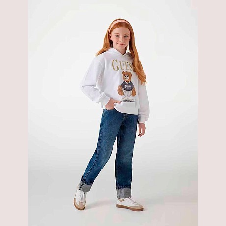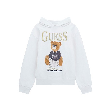 Толстовка Guess – это идеальный выбор для девочек! Изготовленная из 100% хлопка, она украшена очаровательным принтом медведя в костюме и надписью Guess. Белая основа с золотистым медведем и надписью создает стильный и уютный образ. На фотографиях видна аккуратная белая ткань, удобная посадка и мягкая текстура ткани. Качество от бренда из США и внимание к деталям делают эту толстовку отличным выбором для вашего подростка!