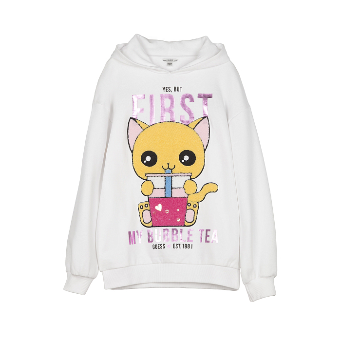 Толстовка Guess – это идеальный выбор для девочек! Изготовленная из 100% хлопка, она украшена очаровательным принтом с милым котом и надписью My Bubble Tea. Нежная белая основа с яркими розовыми и синими акцентами создает игривое и в то же время уютное настроение. На фотографиях видна аккуратная белая ткань, мягкая текстура и удобная посадка. Качество от бренда из США и внимание к деталям делают эту толстовку отличным выбором для вашего ребенка!