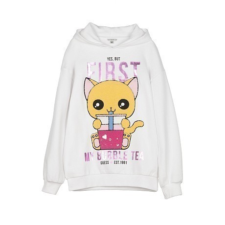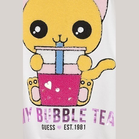 Толстовка Guess – это идеальный выбор для девочек! Изготовленная из 100% хлопка, она украшена очаровательным принтом с милым котом и надписью My Bubble Tea. Нежная белая основа с яркими розовыми и синими акцентами создает игривое и в то же время уютное настроение. На фотографиях видна аккуратная белая ткань, мягкая текстура и удобная посадка. Качество от бренда из США и внимание к деталям делают эту толстовку отличным выбором для вашего ребенка!