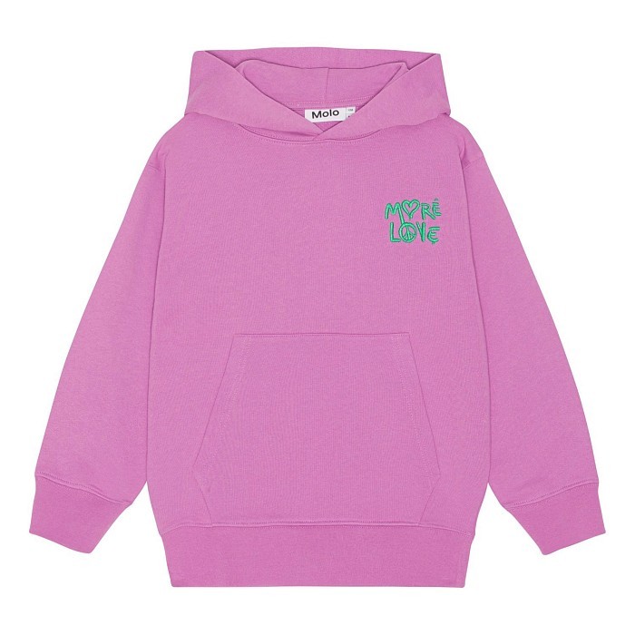 Толстовка Molo фуксия – это идеальный выбор для девочек! Изготовленная из 100% натурального хлопка, она обеспечивает комфорт и уют. Стильный принт 'More Love' в зеленом цвете на фуксийном фоне делает эту толстовку не только функциональной, но и модной. На фотографиях видна удобная посадка, мягкая текстура ткани и стильный принт на груди. Качество от датского бренда Molo и внимание к деталям делают эту толстовку отличным выбором для вашего ребенка!