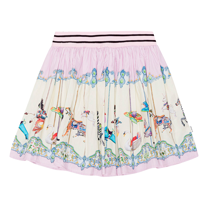 Юбка Molo – это идеальный выбор для маленьких модниц! Изготовленная из 100% натурального хлопка, она украшена очаровательным принтом карусели с животными и цветами на белом фоне. Яркие и разнообразные животные, такие как лошади, зебры, птицы и другие, создают веселое и яркое настроение. На фотографиях видна аккуратная розовая окантовка по краю и мягкая текстура ткани. Качество от бренда из Дании и внимание к деталям делают эту юбку отличным выбором для вашего ребенка!