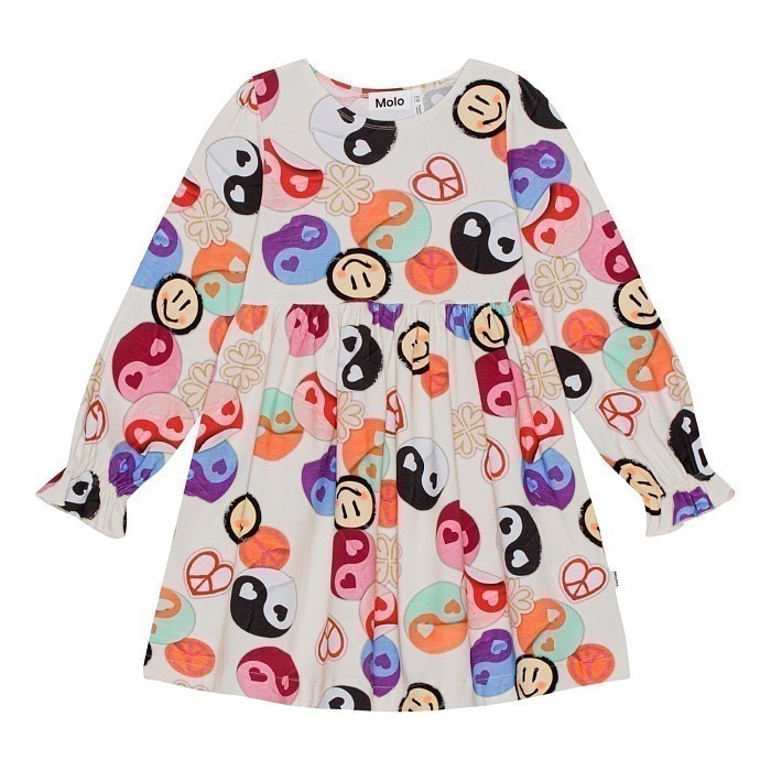 Платье для девочек Molo светло-бежевого цвета – это идеальный выбор для маленьких модниц! Изготовленное из 95% хлопка и 5% эластана, оно украшено очаровательными лицами и сердечками в разноцветных кругах. Нежная белая основа с яркими и радостными принтами создает игривое и в то же время уютное настроение. На фотографиях видна аккуратная резинка на поясе и мягкое платье с длинными рукавами. Качество от датского бренда и внимание к деталям делают эту модель отличным выбором для вашего ребенка!