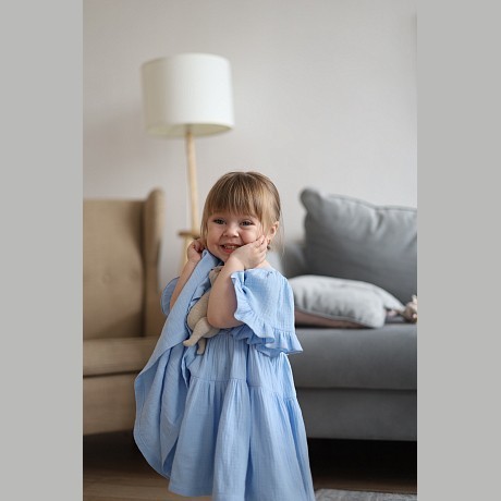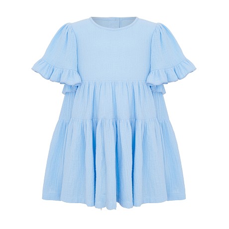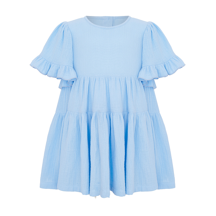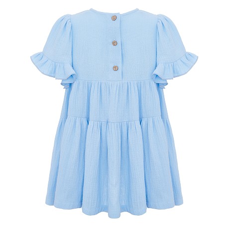 Платье для девочек Piccino Bellino – это идеальный выбор для теплых дней! Изготовленное из 100% органического хлопка, оно украшено красивыми голубыми рюшами на рукавах и по низу. Круглый вырез горловины и застежка на пуговицы делают его удобным и стильным. На фотографиях видна аккуратная голубая окантовка по краю и мягкая текстура ткани. Качество от бренда из России и внимание к деталям делают эту модель отличным выбором для вашего ребенка!