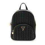 Этот черный рюкзак от американского бренда GUESS станет любимой вещью вашей дочери! Модель выполнена из качественного полиуретана с фактурной стеганой отделкой в виде плетения, что придает ему премиальный вид. На передней части расположен удобный карман с изогнутой молнией, украшенный милыми золотистыми сердечками-подвесками. Классическая треугольная металлическая табличка с логотипом подчеркивает статусность и отличный вкус. Идеальный выбор для школы, сада или прогулок!
