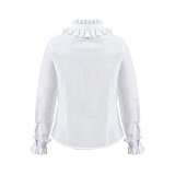 - 🎨 Дизайн: высокий воротник-стойка с рюшами, манжеты с воланами, пуговицы в тон